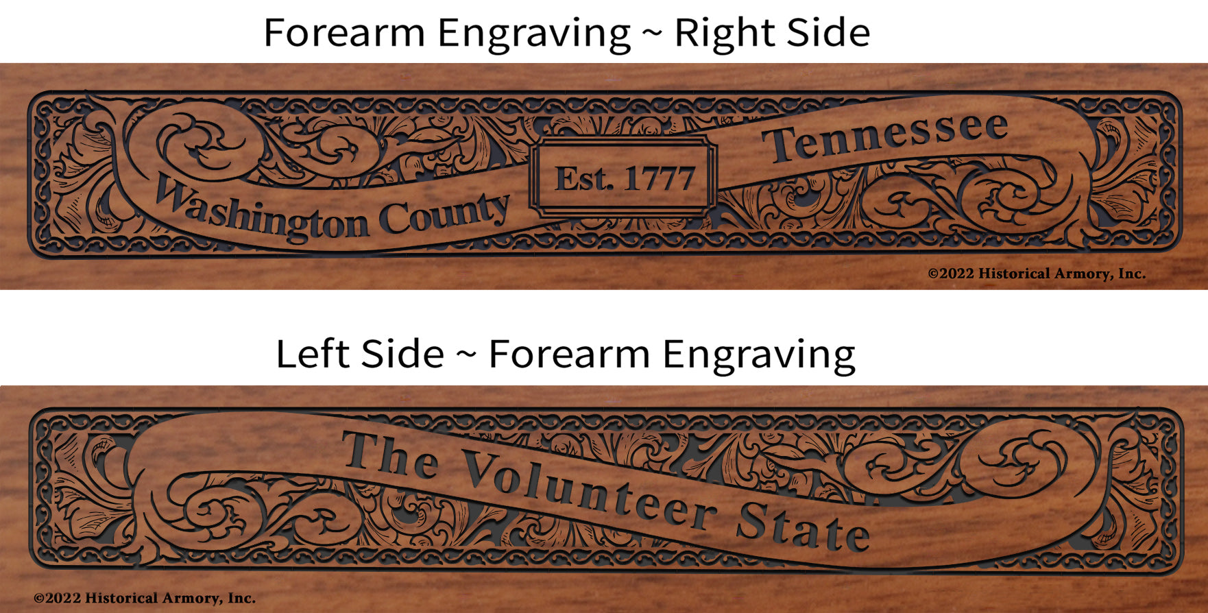 - Detailed engraving on both sides of the American walnut forearm, with the name and establishment date of your county on the right side and your state name and nickname on the left side.