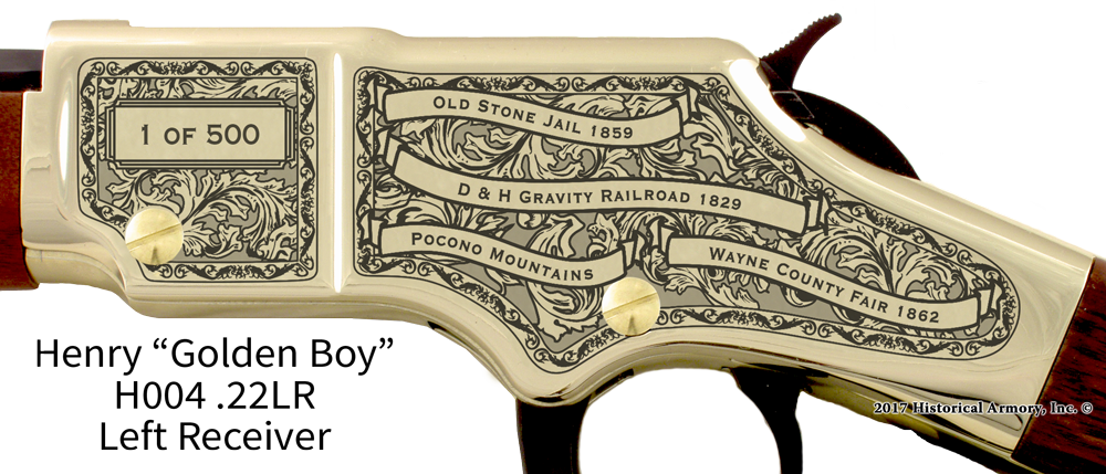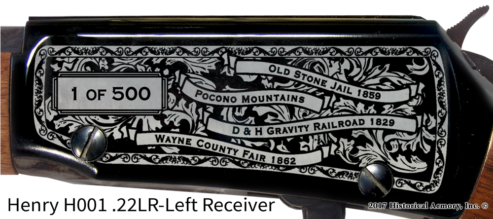 In honor of your county's rich historical legacy, Historical Armory is proud to present the Wayne County Pennsylvania Limited Historical Edition Rifle. Produced on the affordable, American-made Henry .22 LR rifle (Model H001 & H004) and .30-30 (Model H009BG), the Wayne County Pennsylvania Limited Historical Edition rifle combines meticulous research, original artwork, and finely detailed engraving to celebrate the history of Wayne County. There will only be 500 Wayne County Pennsylvania rifle sets ever produced by Historical Armory. Purchase each model separately or all available rifle models together for a complete limited edition set.