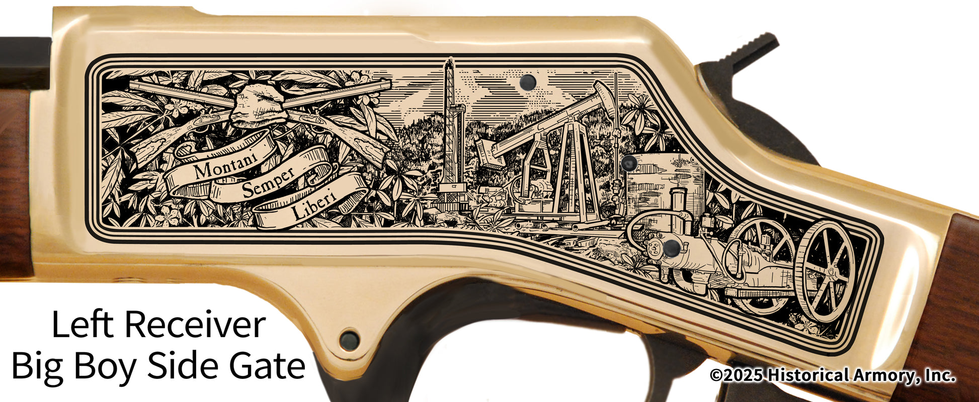 In honor of West Virginia's essential role in securing America's energy future, Historical Armory is proud to present the West Virginia Oil & Gas Limited Edition Rifle. Available on the fully functional, American-made Henry .22LR (H001), Golden Boy (H004), Big Boy (H006G, H006GC, or H006GM), and .30-30 (H009BG) models. The West Virginia Oil & Gas Limited Edition Rifle features original artwork, detailed engraving, and optional personalization, all designed to commemorate the oil and gas industry of West Virginia, one of America's leading energy producing regions.