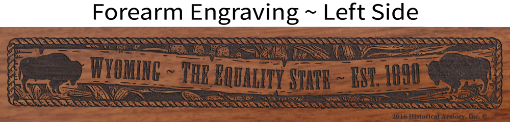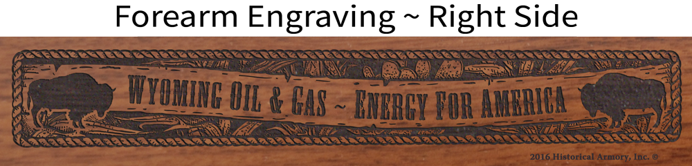 The right side of the American walnut buttstock is engraved with an intricate, original piece of artwork featuring images honoring the oil and gas industry of Wyoming, while reserving the left side of the buttstock for custom personalization.